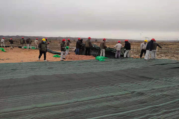 由于公司電石泥堆場地更換為新原料堆場造成的部分土地裸露,造成揚塵污染,治風沙、阻揚塵這項工作迫在眉睫;初冬的天氣冷風呼啦啦掃動著滿地的枯葉紙屑,濃黑的云像一團團破絮,倒懸在我們的上空,北風呼呼那個吹,任憑它的怎么肆虐卻擊退不了職工們工作的熱情,瞧他們單膝蓋在潮濕的泥土上細心的用鐵絲鏈接著每個接口。男職工展現大力水手的魅力,兩人一卷,一人一卷有序的擺放在裸露的土地中央,女同事也不甘示弱拆開整卷防塵網整齊的鋪在砂石頂部,大家喊著整齊的口號,經過一早上不懈努力,就將整個原料場地覆蓋完畢。既抑制滿天風沙的場景,也保存了大量的原料被風帶走,造成原料損耗。