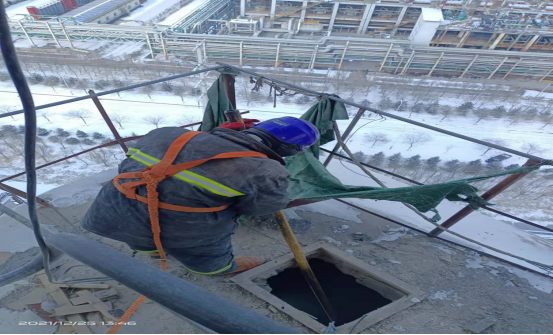 檢修人員鉆進預熱器檢查門子是檢修預熱器管道的“必經之路”,也是支撐徹底完成預熱器檢修的關鍵環節。因為時間緊、任務重,為了不影響檢修進度,檢修人員常常進去干干凈凈,出來時灰土灰臉,不得不輪番上陣,從上到下,完成結皮清理。他們四人一組,從安全監護到技術指導,干一干,歇一歇,接著再繼續……即便是當前零下十幾度,也能干出一身汗,喝口水的功夫,滲出的汗液就能結成冰。