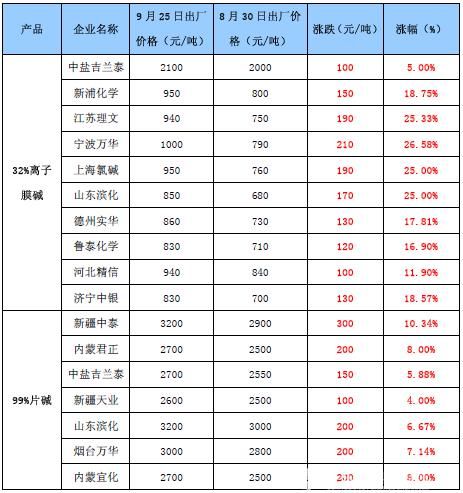 進(jìn)入9月,國(guó)內(nèi)燒堿市場(chǎng)終于打破7月以來(lái)的平衡狀態(tài),價(jià)格出現(xiàn)迅猛上漲走勢(shì)。截至9月25日,山東地區(qū)32%離子膜堿市場(chǎng)均價(jià)上漲135元/噸至800元/噸,漲幅為20.3%,內(nèi)蒙地區(qū)99%片堿上漲200元至2650元/噸,漲幅為8.16%。相比而言,片堿市場(chǎng)表現(xiàn)相對(duì)溫和,液堿市場(chǎng)則更顯迅猛。